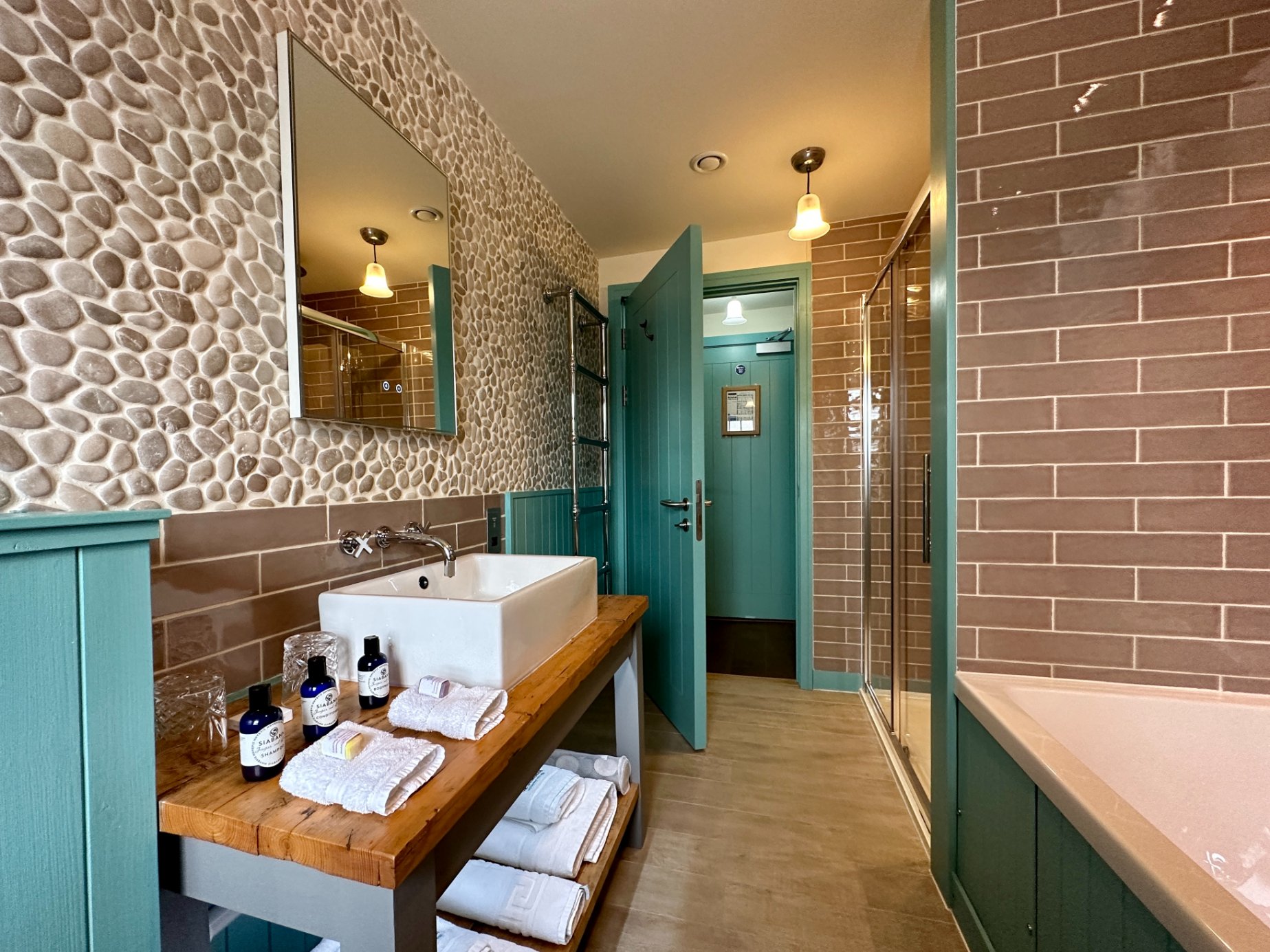 The en-suite bathroom has a beautiful photograph of Rackwick beach with its yellow sand and big round boulders hanging over a deep large bath and an amazing whale sculpture sitting on the stone window sill, the walls are decorated stone pebbles so you can imagine you are sitting on Rackwick beach and it has plenty of luxury touches such as underfloor heating, large double ended bath tub and rainfall shower, magifying mirror,mist free light up wall mirror and complementary Scottish toiletries.